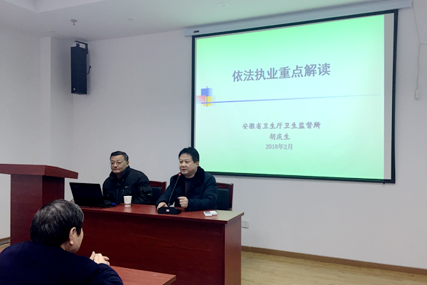 2月11日-12日,我院在全院全体医生开展首批依法执业培训工作。此次培训通过合肥市卫生监督协会协邀请到安徽省卫生监督所医疗机构监督科主任胡庆生、安徽省卫生监督所传染病与中医服务监督科主任马志鑫、合肥市卫生监督所医疗机构管理主任王姣和合肥市卫生监督所所长汪百鸣以上四位专家讲课。