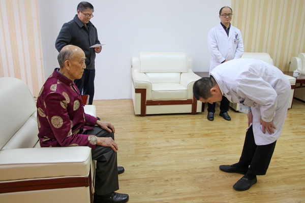 仪式上,继承人推拿科刘存斌主任、康复科胡修强主任分别与指导老师——国医大师李业甫教授签订了拜师协议书,向指导老师行鞠躬礼,并敬茶献花,李业甫教授赠予两位学生书籍。通过当天举行的拜师仪式,第六批继承工作师承关系正式确立,继承人将通过3年的跟师学习,传承发扬李业甫教授五十余年积累下来的宝贵临床经验和学术思想,让更多百姓受益。