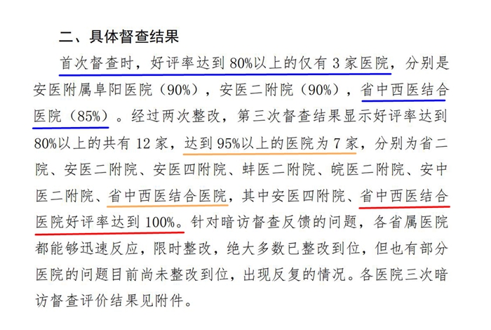 我院在专项活动的三次暗访督查中,好评率均为前列且零差评。具体数据如下:
