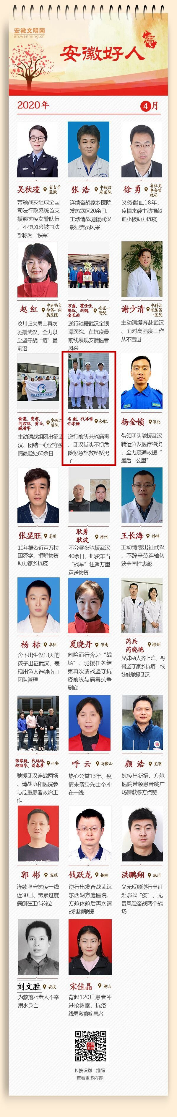 带领战友组成全国司法行政系统首支援鄂抗疫女警队伍、不惧风险被司法部称为“铁军”的安徽省女子监狱十六监区政治教导员吴秋瑾;连续奋战家乡医院发热病区20余日、主动请战驰援武汉彰显党员风采的中铁四局中心医院内三科主任、副主任医师张浩;义务献血18年、疫情来袭主动捐献血小板助力抗疫的安徽省机关事务管理局公共机构节能处处长徐勇;汶川归来勇士再次驰援武汉、全力以赴坚守战“疫”最前沿的安徽中医药大学第一附属医院(安徽省中医院)感染管理科科长赵红;逆行驰援武汉金银潭医院、在抗疫最前线展现安徽医者风采的安徽医科大学第一附属医院第二批支援湖北医疗队万磊、霍佳佳、陈红、刘钢、金长雨;主动请缨奔赴武汉、面对高强度工作从不言退的中国科学技术大学附属第一医院(安徽省立医院)感染管理办公室副主任护师谢少清;主动请战组团出征武汉、团结一心坚守疫情最险处60余日的安徽医科大学第二附属医院第一批支援湖北医疗队俞霞、费君、闫君丽、黄兵、臧清华;逆行前线共战病毒、武汉街头不惧危险紧急施救坠桥男子的安徽省中西医结合医院重症医学科主治医师韦彪、重症监护室护士代冰雪、脑病二科护士许孝姗;带领团队驰援武汉转运分发医疗物资、全力疏通救援“最后一公里”的淮北“蓝天救援队”副队长杨金锁;10年捐资近百万扶困济学、捐赠物资助力家乡抗疫的亳州市蒙城县庄周街道东光村退伍军人张显旺;不分昼夜驰援武汉40余日、把货车当“战车”往返万里运送物资的宿州市泗县泗城镇朱桥社区居民耿勇、耿波;主动请缨出征武汉、不辞辛劳连轴转获全国性表彰的蚌埠市第一人民医院呼吸内科副主任医师王长海;舍下出生仅13天的孩子出征武汉、表现出色入选钟南山团队管理的ICU病区的阜阳市肿瘤医院重症监护室护士长杨标;向险而行奔赴“战场”、驰援任务结束再次请战坚守抗疫前线与病毒抗争到底的安徽理工大学第一附属医院(淮南市第一人民医院)日间医疗管理中心副主任、护士长夏晓丹;兄妹两人齐上阵、哥哥坚守家乡抗疫一线妹妹驰援武汉的滁州市第一人民医院医生芮兵、芮晓艳;驰援武汉连战两场、请战协和医院参与危重患者救治工作的六安市霍邱县支援湖北医护人员张家婕、代远远、赵丽华、刘春景;热心公益13年、疫情来袭身先士卒冲在一线的马鞍山市“七姐妹”志愿服务队队长呼云;抗疫出新招、方舱医院带领患者跳广场舞获多方点赞的皖南医学院弋矶山医院重症医学科护师颜浩;连续坚守抗疫一线近30日、劳累过度病倒在工作岗位的宣城市经开区飞彩街道莲西社区党委书记郭彬;逆行出发奋战武汉东西湖方舱医院、方舱休舱后再次请战继续驰援的铜陵市妇幼保健院放射科副主任医师钱跃龙;义无反顾逆行出征赴鄂战“疫”、无畏风险奋战两个战场的池州市第二人民医院重症医学科主管护师洪鹏翔;为救落水老人不幸溺水身亡的安庆桐城市新渡镇杨树店村村民刘文胜;背起120斤患者冲进抢救室、抗疫一线勇救癫痫患者的黄山市人民医院护士宋佳晶。