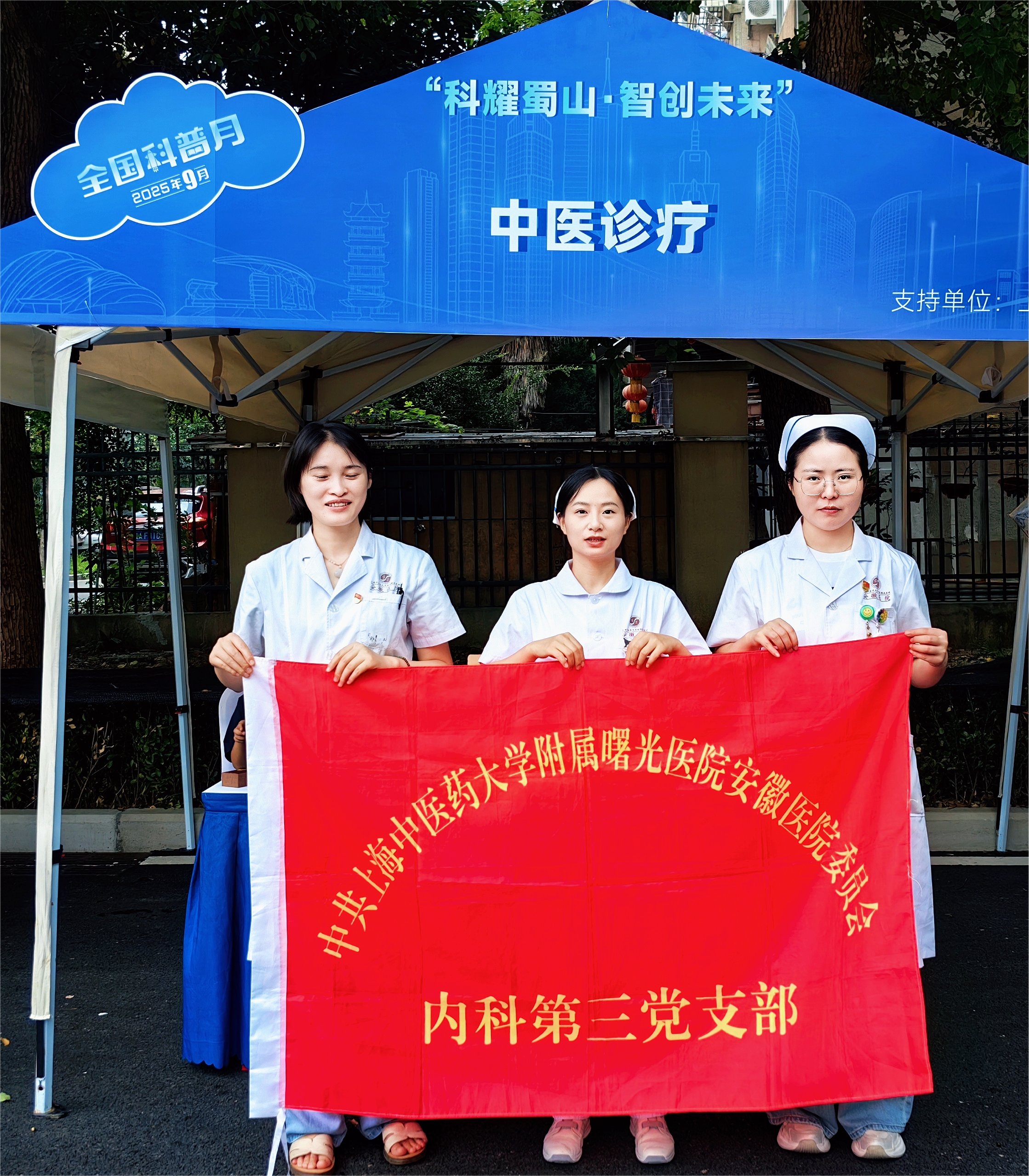 9月6日,上海曙光医院安徽医院内科第三党支部的党员医护团队为积极响应“全国科普月”号召,参与了医院党委在1986科创园开展的主题为“传播中医药健康文化,提升全民健康素养”的中医义诊活动。