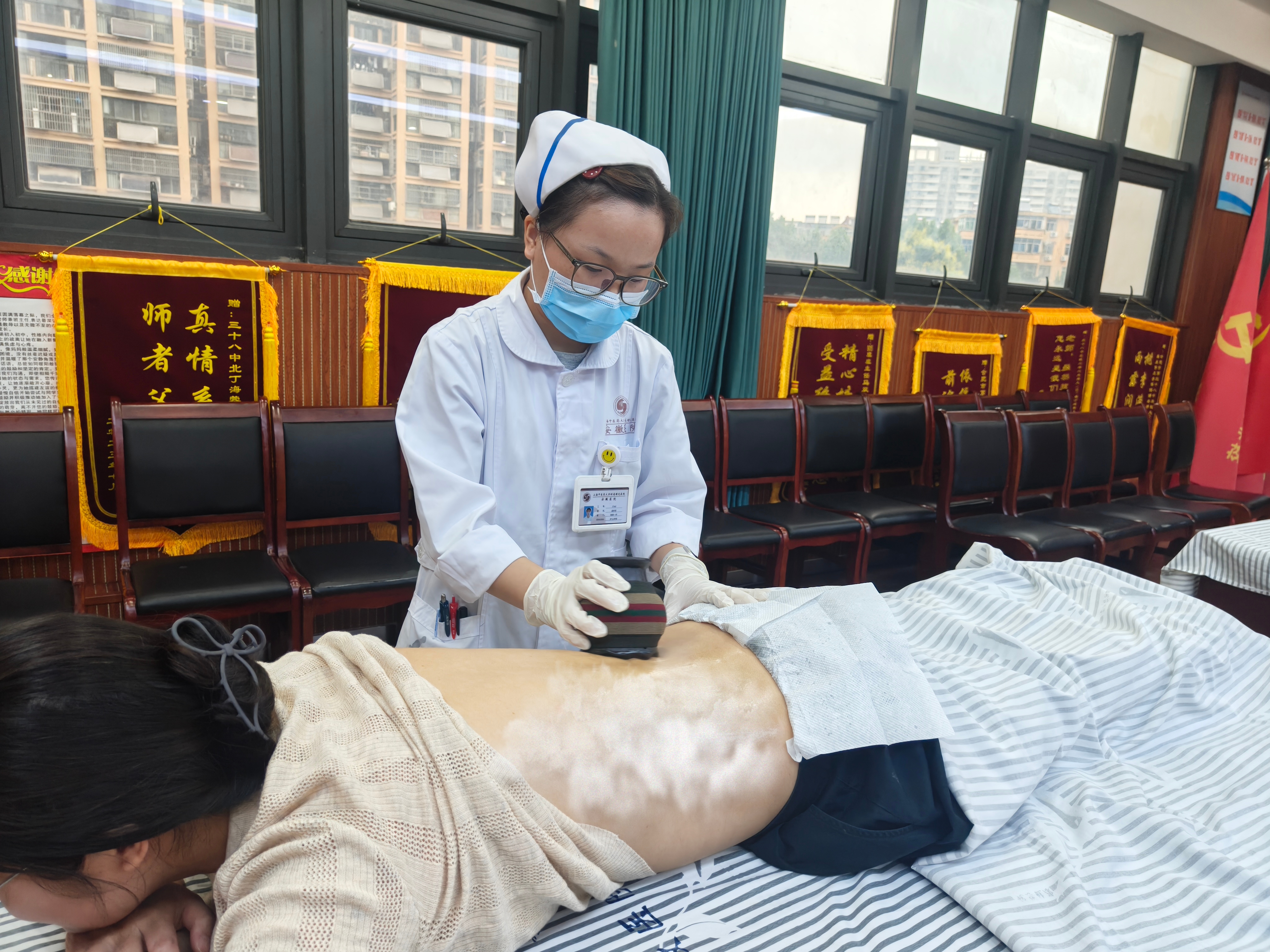 下午两点,义诊活动在学校会议室准时开始。我院精心安排了多项中医适宜技术体验,包括拔罐及温通罐,用以疏通经络,活血化瘀,驱寒除湿;刮痧用以疏通经络,调和气血、清热排毒,驱邪外出,调和阴阳,平衡机能;耳穴压豆用以调节情绪、改善疲劳、失眠;中医推拿用以缓解颈肩僵硬疼痛等。中医传统疗法起到了立竿见影的效果,老师们纷纷称赞。